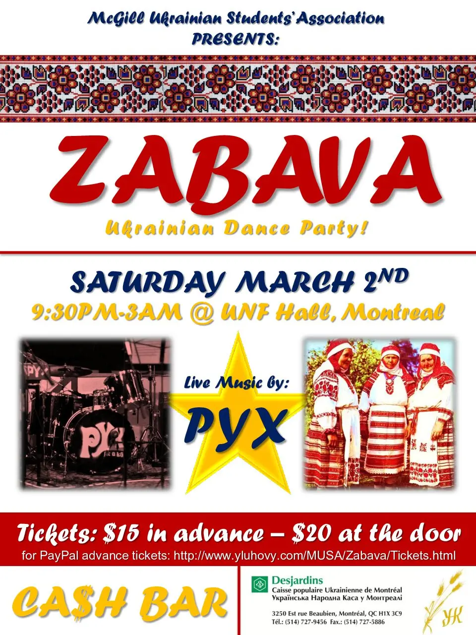 The McGill Ukrainian Students’ Association (MUSA) will be hosting a Zabava on March 2, 2013! PYX, a six-person tsunami of polka, waltz and Ukrainian thrash will be joining us from Toronto to play the night. All proceeds go to Help Us Help the Children, a project of the Children of Chornobyl Canadian Fun.