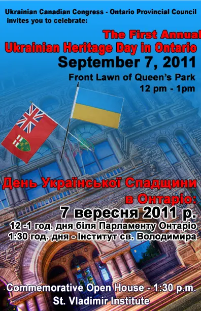 У четвер, 24 березня 2011, парламент Онтаріо одноголосно прийняв Закон про День Української Спадщини, згідно з яким 7 вересня щороку відзначатиметься День Української Спадщини в провінції Онтаріо.